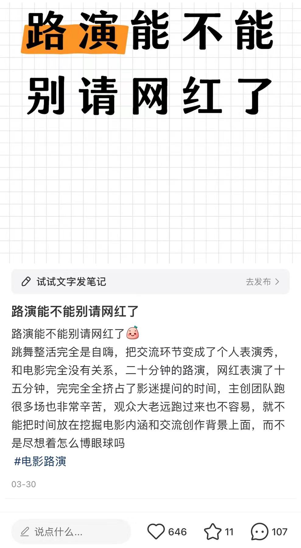 对于路演的变化,从业者们的感知更加明显。小月从事了多年电影发行工作,「《长津湖》的时候,首映礼还是由宣传方自己写台本,主持人和主创聊台前幕后的创作故事,但现在的首映礼都特别形式主义,甚至都不用出台本。我现在做的一个项目就是由短视频营销的观影团负责,他们会找好观众当托,来跟主创做互动,然后在短视频平台传播物料。」