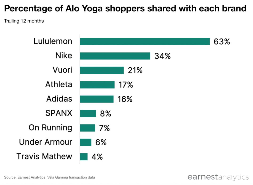 今年4月份Earnest发布的信用卡数据也显示,Alo Yoga的份额正稳步增长。与此同时,报告称购买Alo Yoga的人中有63%的人曾是lululemon消费者,两个品牌用户重叠度极高,这更是让不少人将来势汹汹的Alo Yoga视为了后者的最大竞争者。