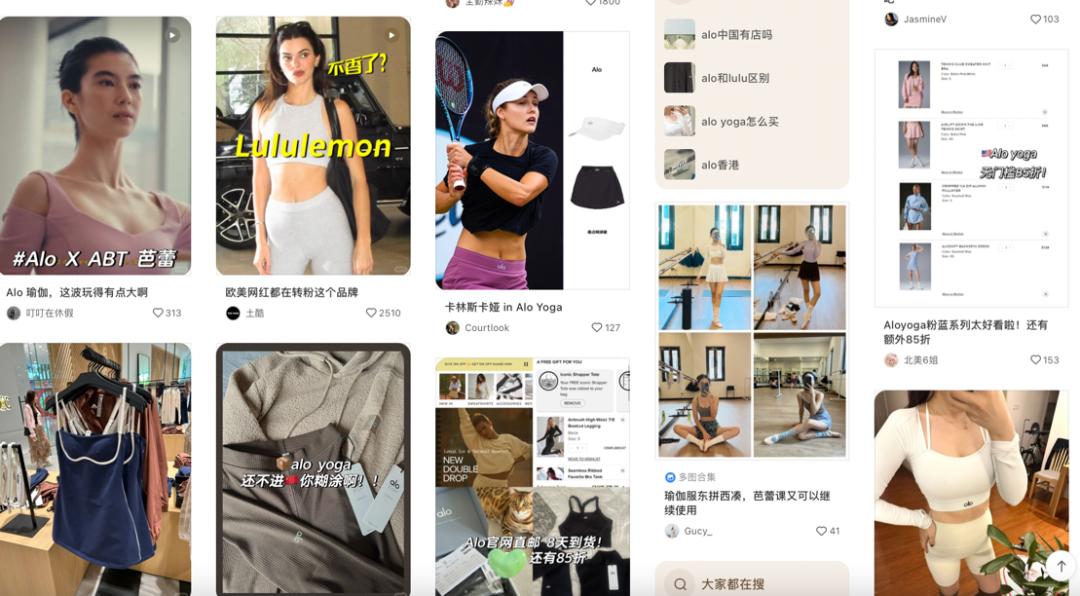 国内目前虽还没有Alo Yoga的线下门店,但这股新潮流显然已经扩散开来。小红书上#Alo、#Alo女孩、#Alo国内怎么买多久到等相关话题的讨论日渐增多,带有「Alo」标志的穿搭也逐渐出现在我们身边。