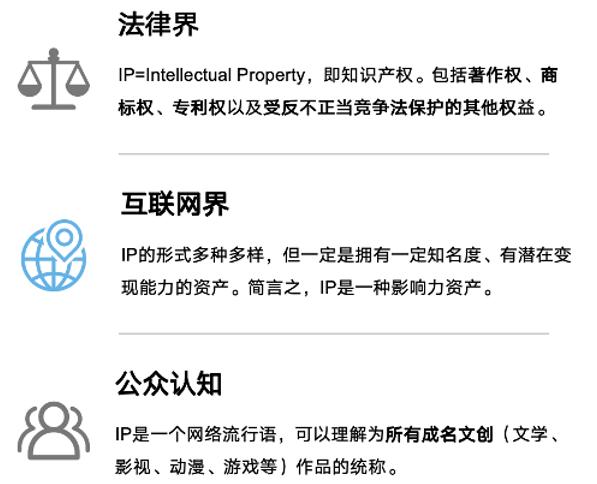 在理解IP运营之前,不妨先快速了解一下“IP”的概念。IP原本是Intellectual Property的缩写,翻译为知识产权,从法律层面来看是智力劳动产生的成果的所有权。伴随着IP商品化的发展,“IP”的定义已经逐渐开始多元化,比如以下三种主流解释: