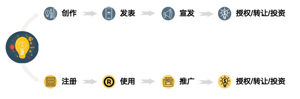即便“IP”已经被赋予了许多新的定义,但其内核仍然是知识产权,而IP运营的本质也可以被理解为不同形式的权利许可和转让。如前文所述,虚拟形象既属于作品,在满足一定条件的情况下还具有标识商品来源的功能。因此,我们需要结合不同的权利基础分别来看两种权利的合规打造方式。如下是著作权和商标权的打造和运营过程: