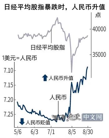 人民币出现升值趋势, 点燃导火索的是8月5日日本股市的暴跌。与日元一样,人民币作为低息货币之前一直被卖出,由于套利交易成为部分买入的对象,同一天触及7.112元的高点。普遍观点认为目前人民币升值是暂时的……