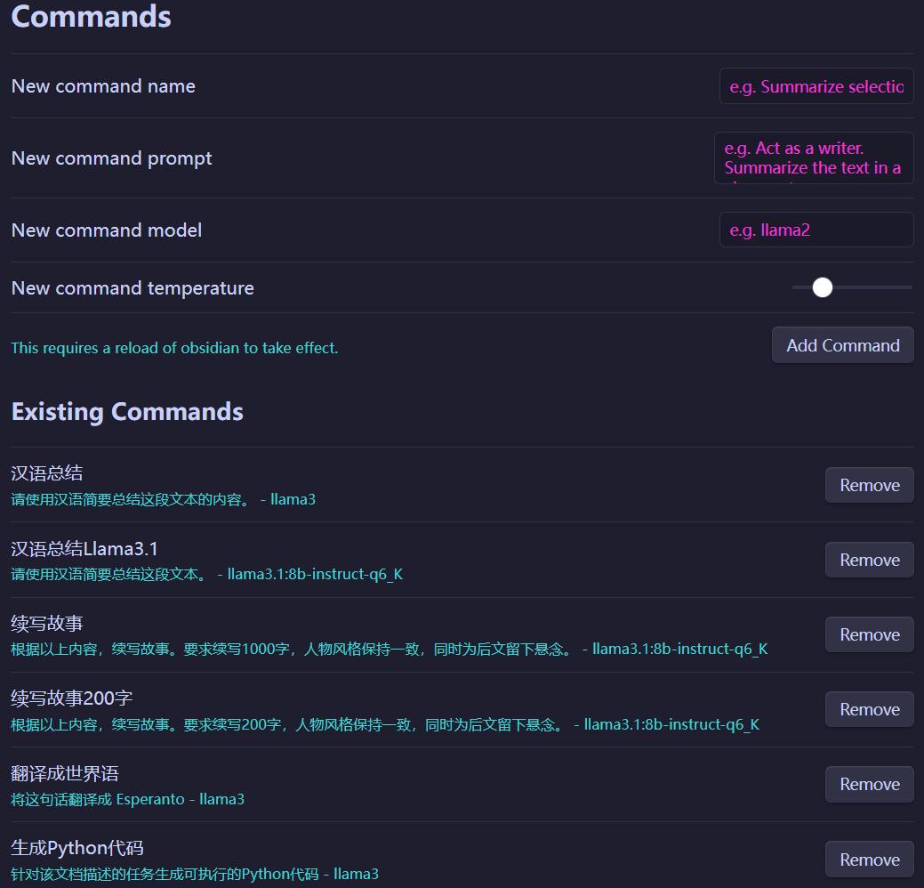 Ollama 插件仅支持前面通过 Ollama 安装的本地模型,但其优势是可以预配置常用提词命令,之后通过 Ctrl+P/Cmd+P 就能方便调用。