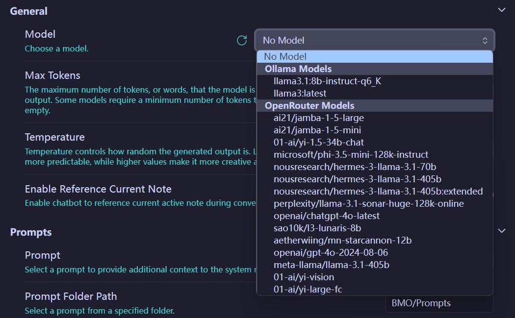 进入选项,你可以在 General 设置中选择你已经安装的本地模型或配置的在线模型。如下图所示,我这里本地安装了一个 Llama 3.1 和一个 Llama 3,同时配置了 OpenRouter 的 API(可访问大量模型)和一个智谱的在线语言模型 GLM-4-Flash。下面可以设置最大 token 数、温度(0-1 之间,值越大生成的文本越有创意)以及选择是否索引当前笔记。