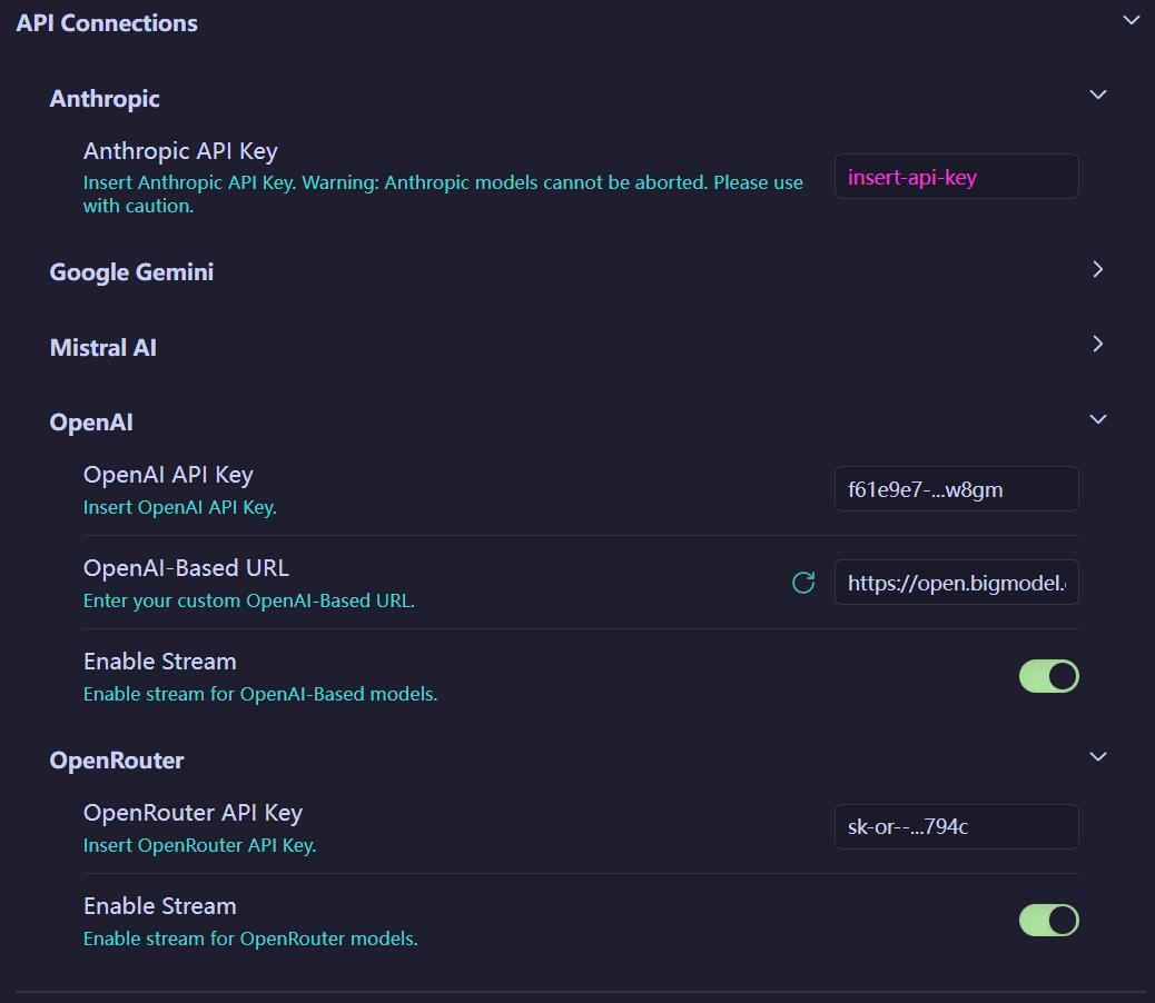 而在更下面的 API Connections 区域,你可以配置在线模型。