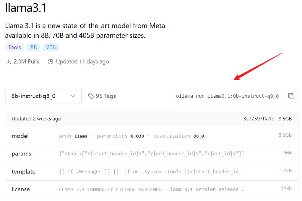之后,进入 Ollama 支持的模型库:https://ollama.com/library ,根据你自身的需求和计算机硬件选择模型,之后运行相应的代码即可。比如如果你想安装一个 8B 参数的经过指令微调和 Q8_0 量化的 Llama 3.1 模型,就运行:ollama run llama3.1:8b-instruct-q8_0