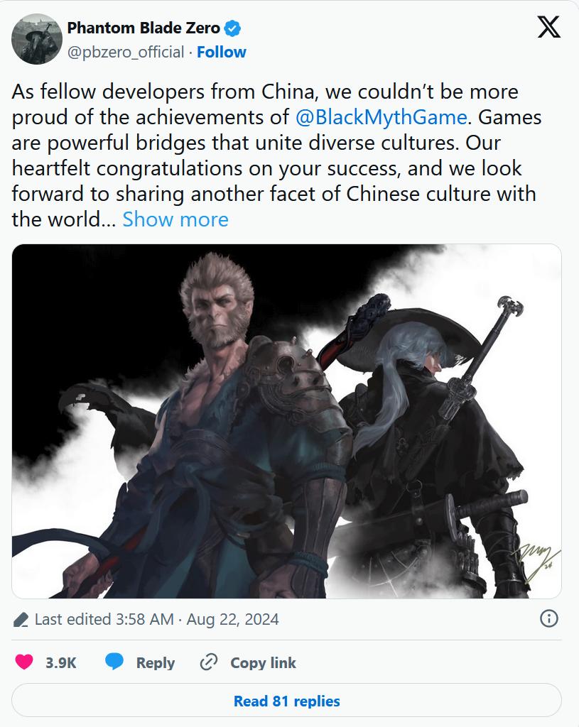 米哈游的《绝区零》,网易的《永劫无间》都是市场表现亮眼的产品。灵游坊的《影之刃:零》在参展同时还不忘发推祝贺《黑神话:悟空》的成功。看到黑神话做买断制做成了,原本在付费模式上有所犹豫的影之刃零,不知道会不会改变主意,最终下决心做买断制。