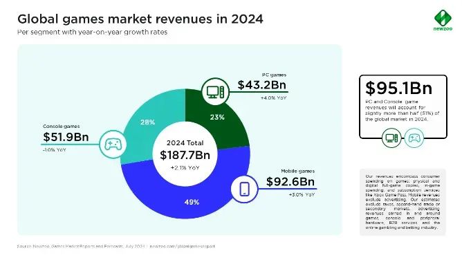 国产厂商冲击PC平台的理由并不复杂,在移动端用户增长陷于停滞、红利逐渐消失的当下,所有人都在寻找扩大玩家群体的机会。据Newzoo的统计,2024年增长最快的是PC平台,比去年增长了4.0%,成为推动游戏产业增长的动力来源。此外PC/移动端玩家与主机端玩家的重合度也很低,只有26%的玩家只使用PC或移动设备,而不使用主机玩游戏。