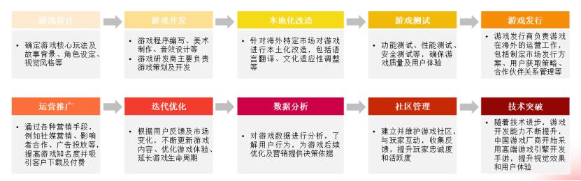 中国出海游戏产品全生命周期流程涵盖游戏设计开发、本土化改造、游戏测试及上线发行、运营推广、产品及内容迭代优化、游戏数据分析反馈、游戏社区运营管理以及技术突破带来的持续性产品变革。