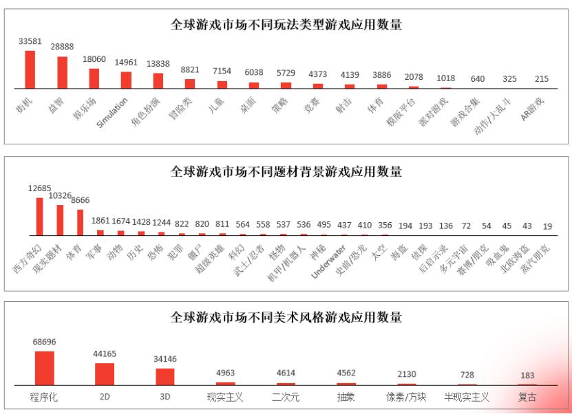 按照玩法类型、题材背景和美术风格划分,全球游戏应用中数量最多的分别是街机类游戏、西方奇幻类游戏和程序化游戏。