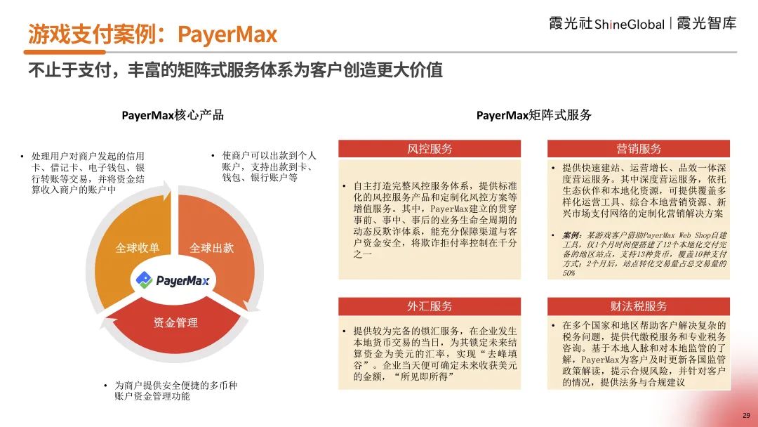 PayerMax的矩阵式服务涉及:风控服务、营销服务、外汇服务及财法税服务