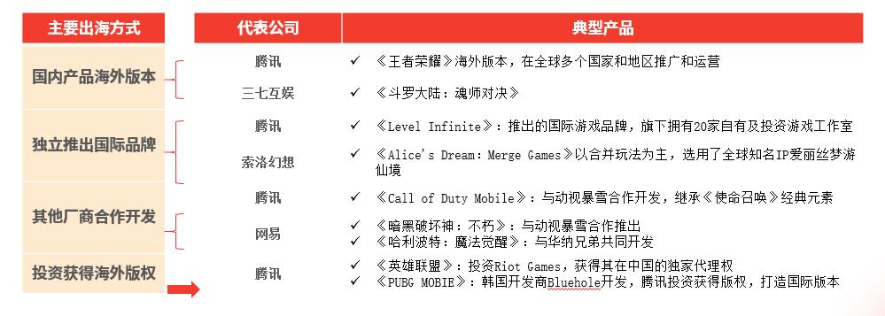 中国游戏进入海外市场的方式主要包括国内现有产品基础上发行海外版本、直接推出国际游戏品牌或产品、与海外其他游戏厂商合作开发游戏产品以及通过投资方式获得游戏应用的海外版权。针对出海模式,国内游戏厂商通常基于自身的业务现状及市场策略进行适用性选择。