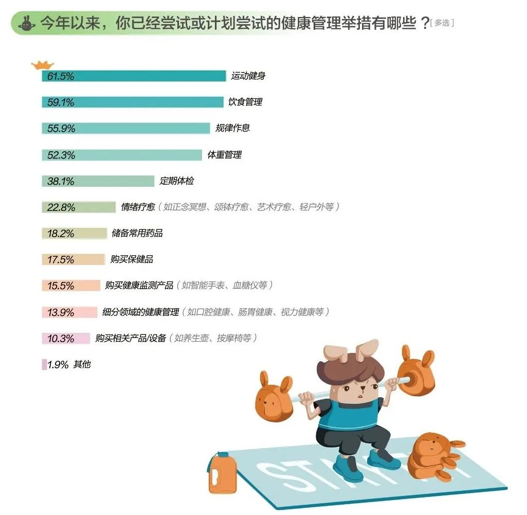 据《2024有意思生活方式报告》,61.5%的人已经践行或将运动健身提上了日程,运动甚至超过了好好吃饭、好好睡觉,排在了健康管理举措的首位。该报告共调研了7725位16-40岁的年轻人,其中女性受访者超七成。