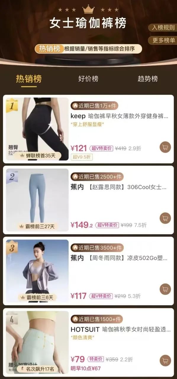 以女性用户为主的电商平台唯品会显示,keep一款早秋高腰瑜伽裤近期销售累计超过1万件;361°的一款瑜伽九分裤,售后评价已超过了2万条。