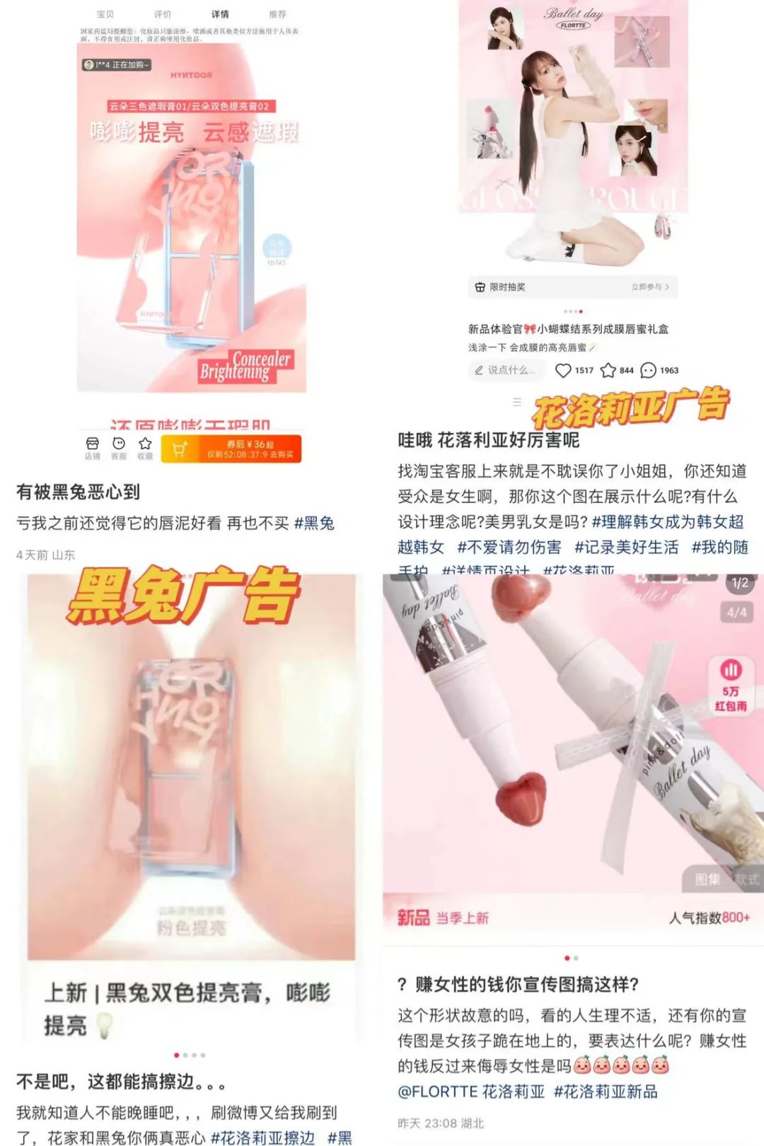 “一边赚女性的钱,一边侮辱女性。”这是国货彩妆品牌花洛莉亚、HYNTOOR黑兔在新品广告中,疑似含性暗示所引发的争议,其部分消费者的吐槽声。