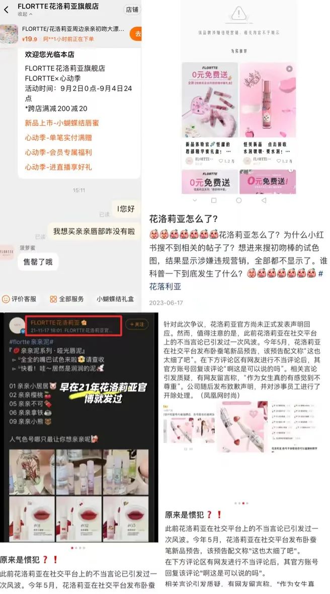 虽有亮眼的业绩,但花洛莉亚多款产品的宣传受到质疑和争议。在擦边事件发酵之中,有网友表示,花洛莉亚在2021年发布的亲亲泥系列·哑光唇泥的色号命名“亲亲小居居”、“亲亲nei nei”、“亲亲阿咪”等引人不适。目前,品牌旗舰店已下架产品,天猫客服表示产品已售罄。