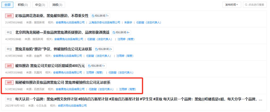 据天眼查显示,HYNTOOR黑兔关联企业黑兔化妆品曾在2018年6月的双随机抽查中检查出通过登记的住所(经营场所)无法联系。