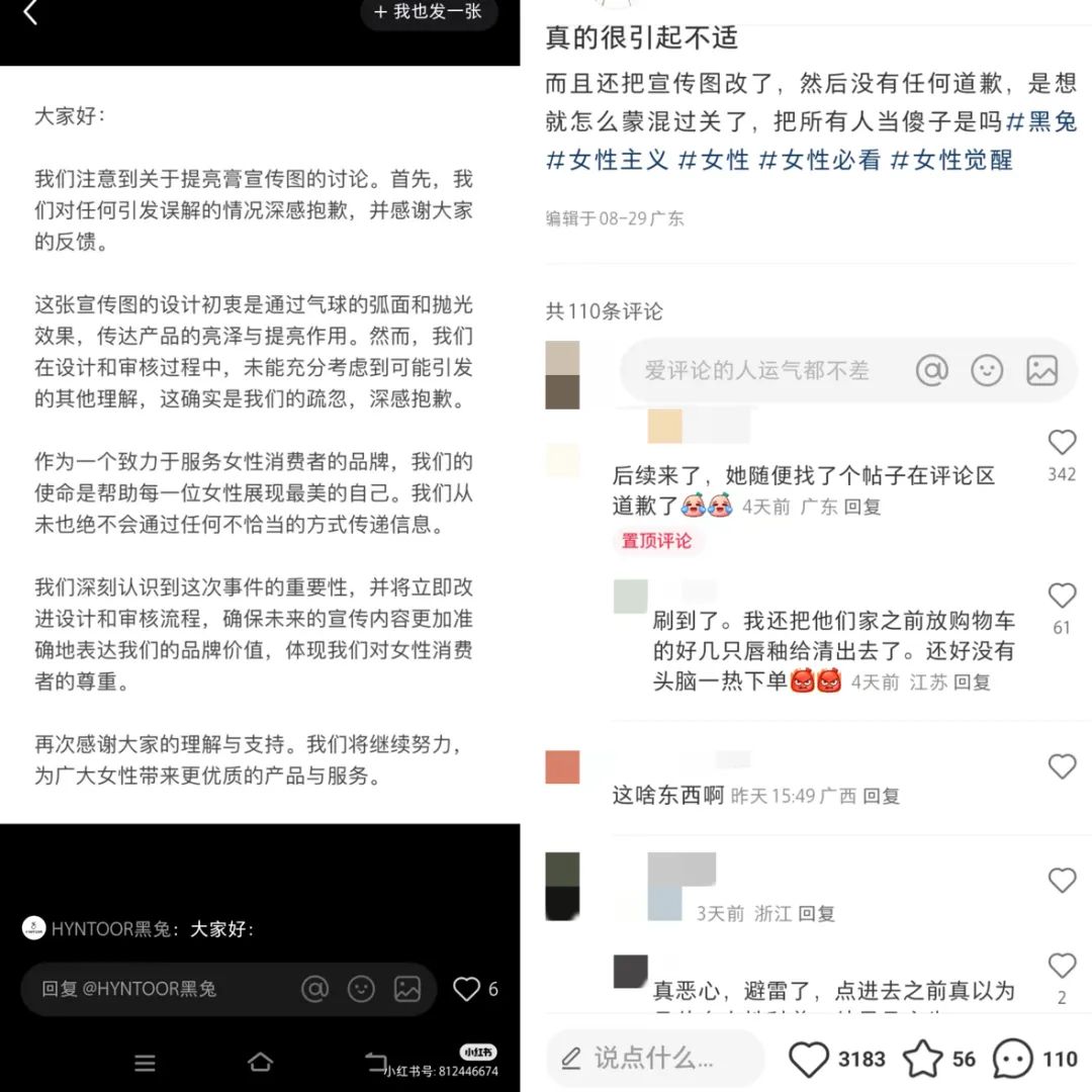 同时,HYNTOOR黑兔还强调,作为一个致力于服务女性消费者的品牌,从未也绝不会通过任何不恰当的方式传递信息,并会立即改进设计和审核流程,确保宣传内容更加准确地表达品牌价值。不过,如今该内容疑似被删除。