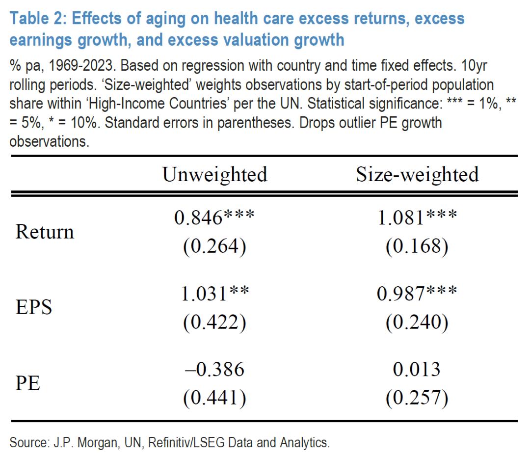 摩根大通在报告里也发现,老龄化与医疗保健行业的长期超额回报之间存在正相关关系——