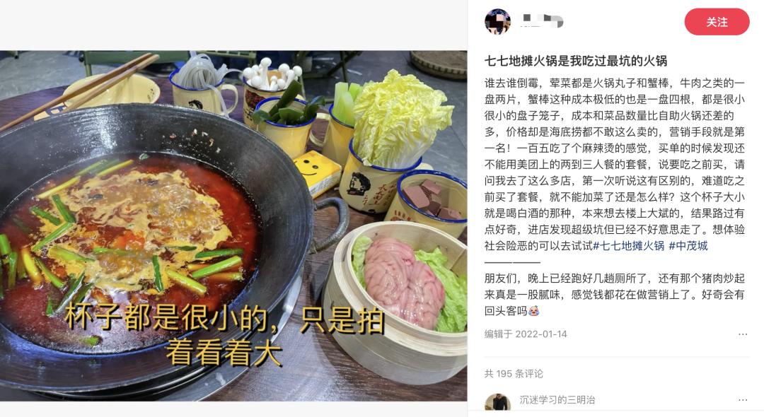 小红书网友发布的“避雷贴”中提到,35元的火锅底料和29.9元的猪肉现切是必须点的,也就是说七七地摊火锅的实际锅底价格为64.1元。