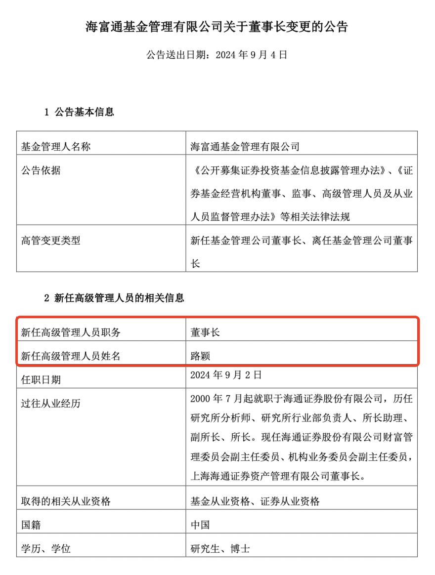 9月3日晚间,海富通基金公告,现任海通证券财富管理委员会副主任委员、机构业务委员会副主任委员,海通资管董事长的路颖,出任公司新一届董事长,原董事长杨仓兵因退休离任。