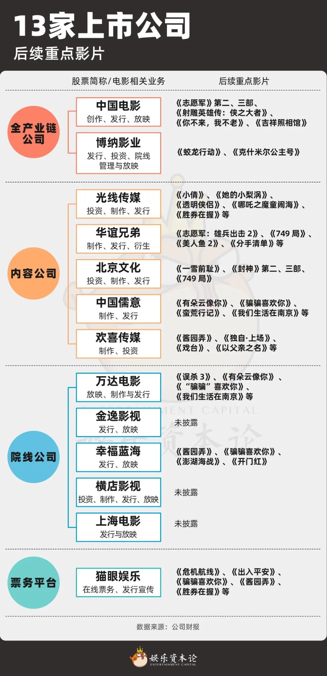 根据各上市企业披露的营业收入构成,我们将13家上市企业分为全产业链公司、内容公司和院线公司、票务平台四类。需要注意的是,多数公司都存在上下游纵向一体化的战略,这一分类方法仅针对当下各公司全产业链战略的实现程度。
