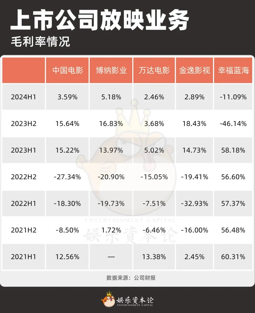上市公司放映业务毛利率情况
