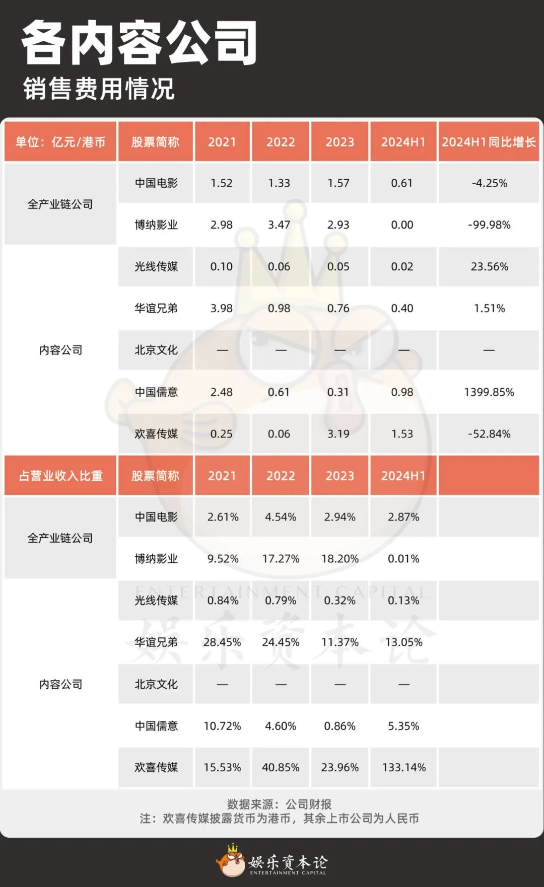 相比之下,中国儒意的销售费用呈现出持续扩张的态势,上半年销售费用近1亿元,同比增长1400%,超过2023年的总和。对比其他内容公司,儒意处在销售费用率的前列,这与儒意布局头部商业片,宣发打法更为固定有关。