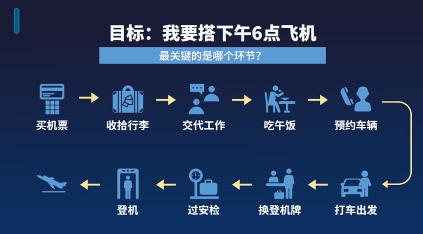 假设我在深圳,目标是搭乘明天下午6点的飞机,从深圳到机场大约需要40分钟的时间,从购买机票开始,收拾行李、交代工作、吃午饭、预约车辆、打车出发、换登机牌、过安检登机,然后乘上飞机离开,需要经过这几个环节。具体如上图所示。