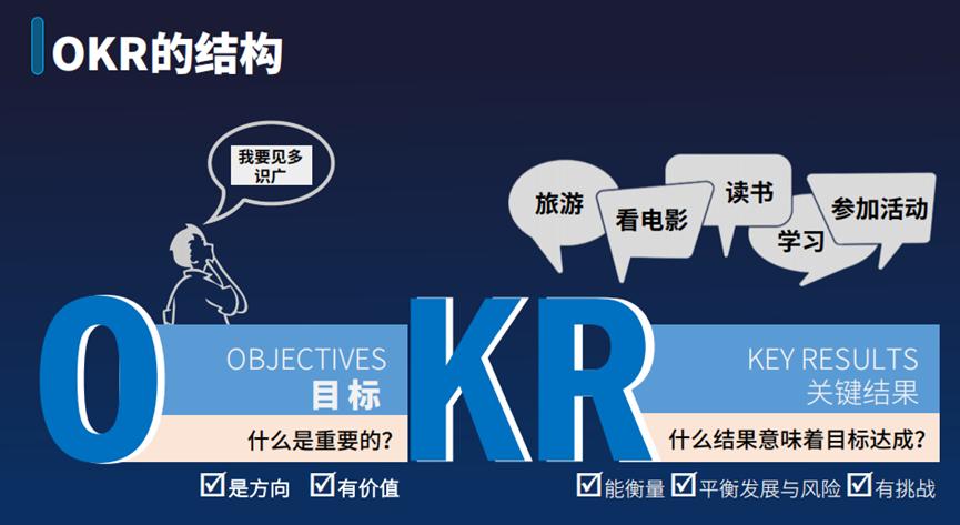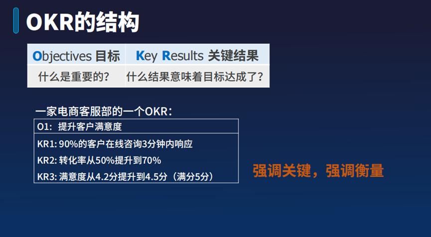所以你会看到OKR强调的是关键,强调的是能衡量。它不是写太长、太多,而是把这个阶段最重要、最关键的写出来。
