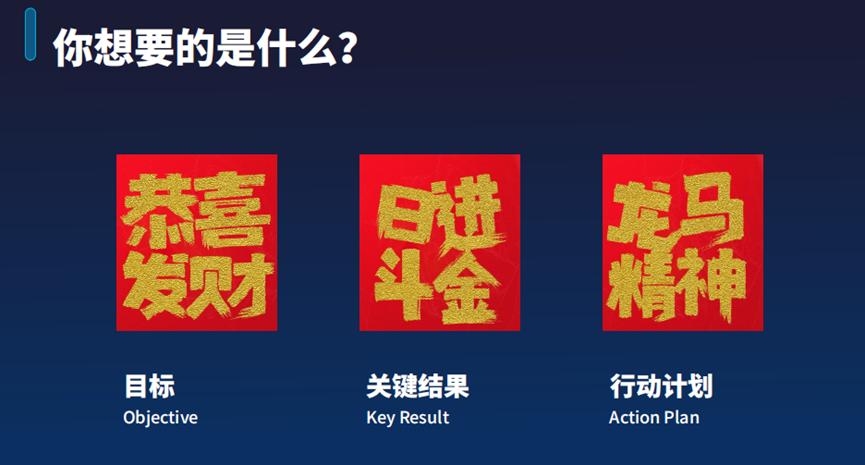 如果将这个OKR进行修改:目标仍然是恭喜发财,关键结果变成日进斗金,即一天赚一斗金子,一斗金子的价值是584万元人民币。要想得到,心想事成并不行,必须具备龙马精神,像龙和马一样努力工作,才能完成任务并实现目标。