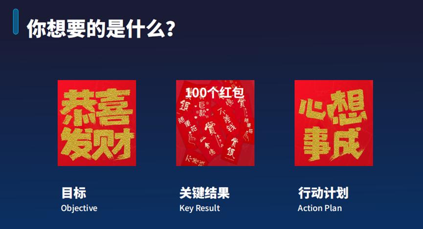 那这个是不是一个OKR?如果仅从目标发财、关键结果可衡量100个红包,也有行动计划,那表面上看,它的确是一个OKR,但并不是一个有效的OKR。