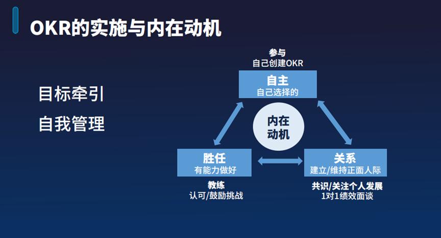 这三个方面共同发挥作用,从而产生一个很好的内在动机,激发起我们小伙伴的内在动力。通过共同目标的牵引,让大家产生强烈的内在动机,进行自我控制和自我管理。这正是OKR能够实施和内在动机关系的原因。