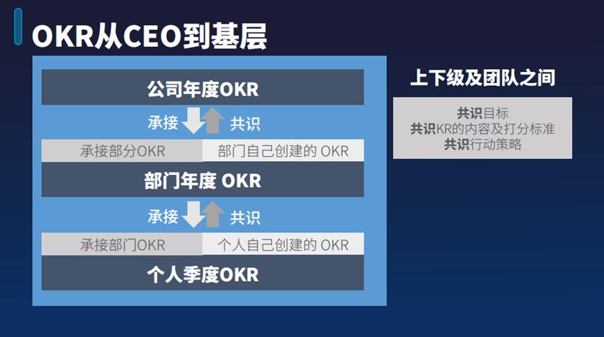 一般而言,在公司内部,从高层至基层,首先要制定公司的年度OKR,然后再做部门的OKR,最后做个人的OKR。在这个过程中,有些OKR需要承接上级,有些则需要自己创建。因此,并非所有的OKR都是只需抄袭上级OKR,而是根据自己的岗位来设定。