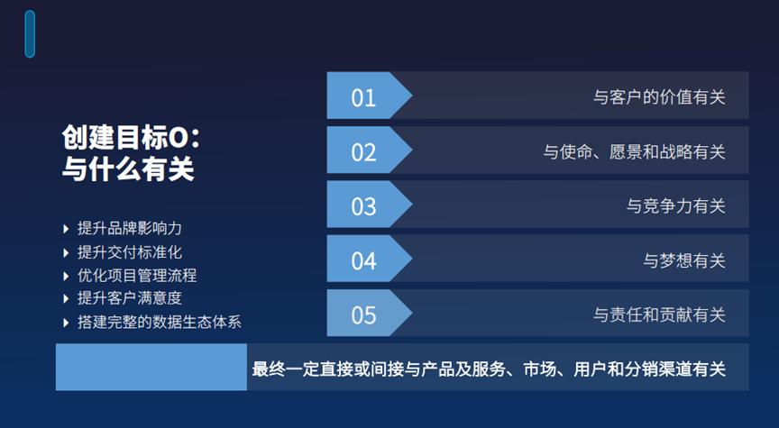 最终确定的OKR应直接或间接关联到企业的产品、服务、市场、用户及渠道等方面。只有这样,我们才能确保所制定的目标能够真正体现企业价值,促进客户满意度的提升,并推动企业实现可持续发展。