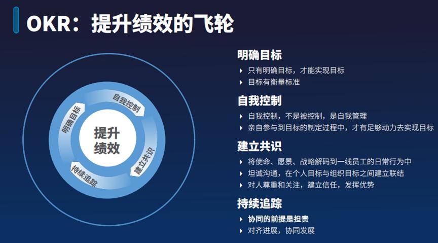 进一步而言,当我们将员工与团队的目标清晰界定,并促使员工实现由被动管理向主动自我管理的转变,同时团队内部建立坚实的共识基础,我们便能在执行中有效追踪与对齐目标,促进整体协同发展。这样,提升绩效的飞轮便能够转动起来。