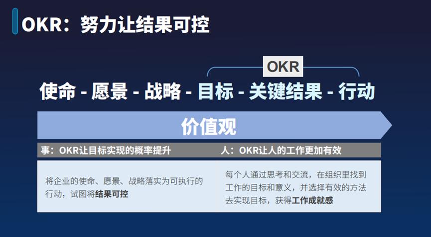一方面是事,提高目标实现的概率。我们通过将企业的使命、愿景、战略等落地为可执行的行动,通过OKR拆解实现结果可控。