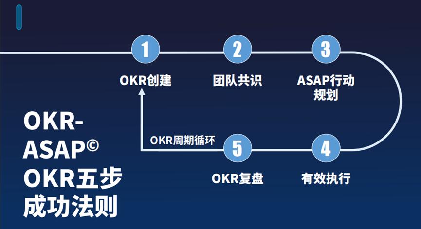 正如我们常说,若未预设衡量标准,便难以判断行动的有效性。在企业内部实施OKR,我归纳出五个核心环节,即“OKR-ASAP”五步成功法则。