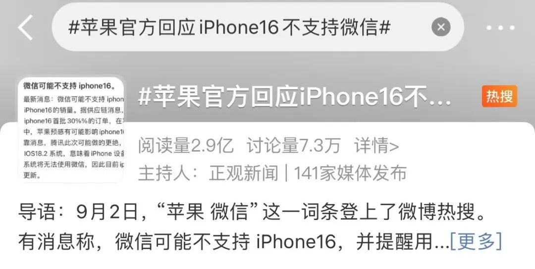 近日,一张“微信可能不支持iPhone 16”的截图,给即将开发布会的苹果送上了热搜榜。