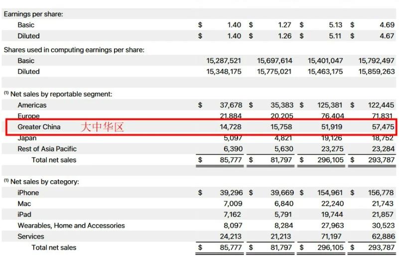 与之形成鲜明对比的是,苹果2024财年第三季度财报中显示,大中华区成为苹果唯一营收(包括服务收入、硬件收入)下降的市场,相比上年同期减少10.3亿美元,同比下滑近7%至147.28亿美元。