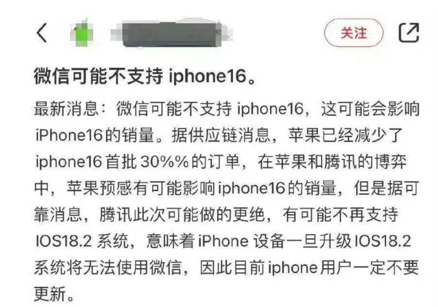 爆料内容还称,iPhone一旦升级到iOS 18.2将无法使用微信,因此目前iPhone用户一定不要更新。另一方面,据供应链消息,目前苹果已经减少了iPhone 16首批30%的订单,似乎也在间接表明iPhone 16或许吸引力不足。
