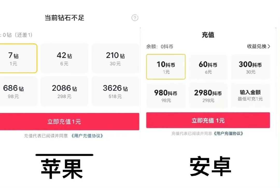 再比如你在某音刷短视频想充值买抖币,安卓用户可以1块钱买10个,而苹果用户1块钱只能买7个。这差的30%的量就是税!