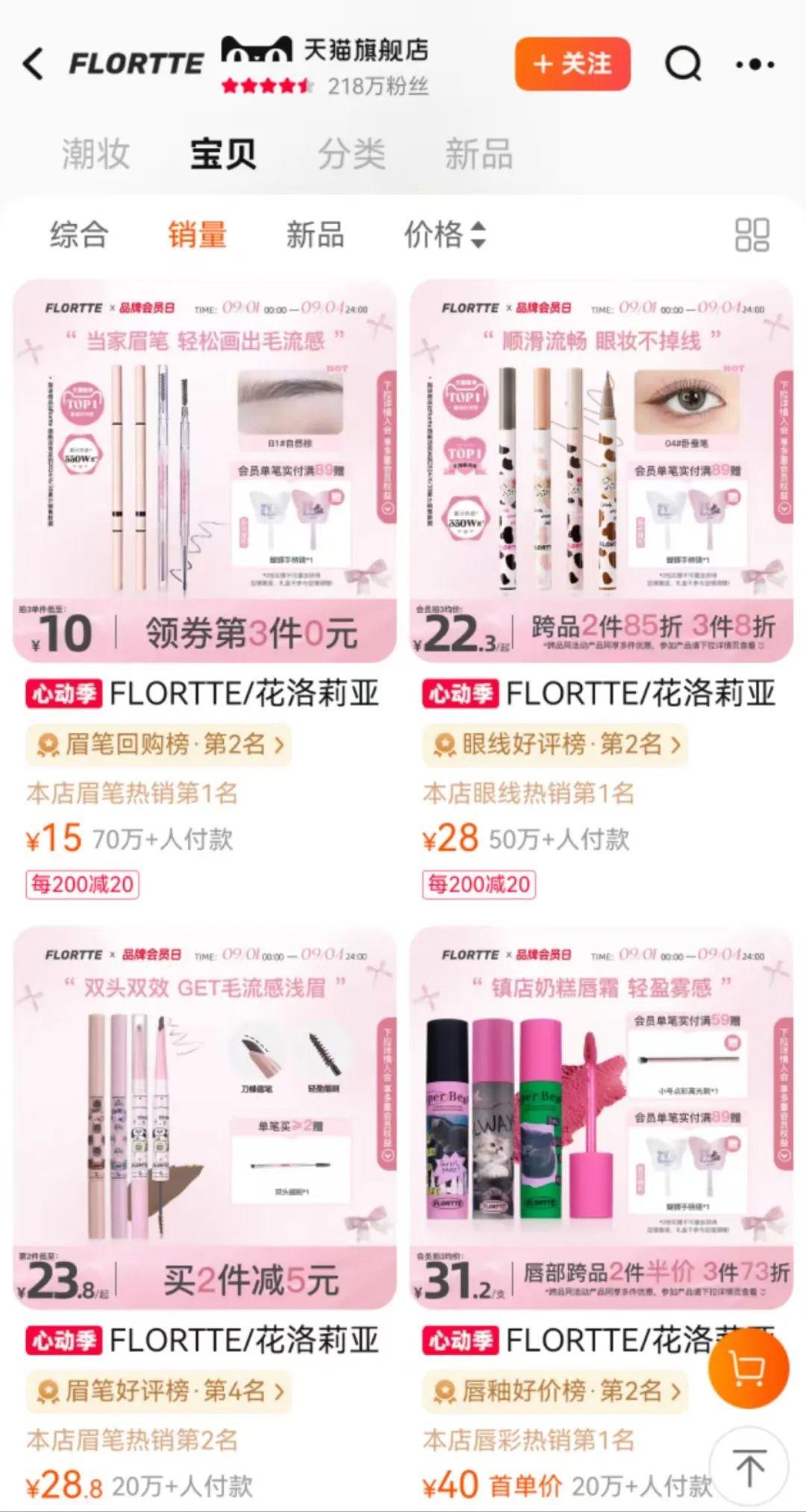 目前,天猫花洛莉亚旗舰店粉丝达218万,店内销量最高的产品为眉笔,有超70万人付款,登上眉笔好评榜第二名,店铺内有6款产品超10万人购买。