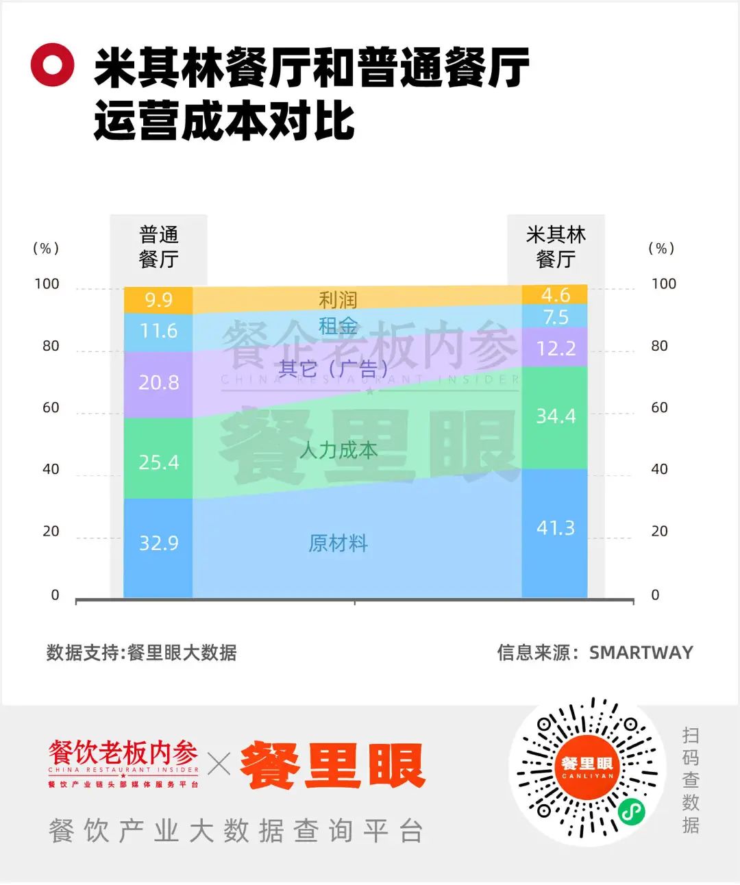 根据第一财经报道的案例显示,人均消费3000元的米其林三星餐厅,前期装修费用高达800万元,厨房设备成本580万元,办公室和办公设备需要100万元,加上其他成本,总共的投资金额高达3000万元。成本收回之路的困难程度,可想而知。