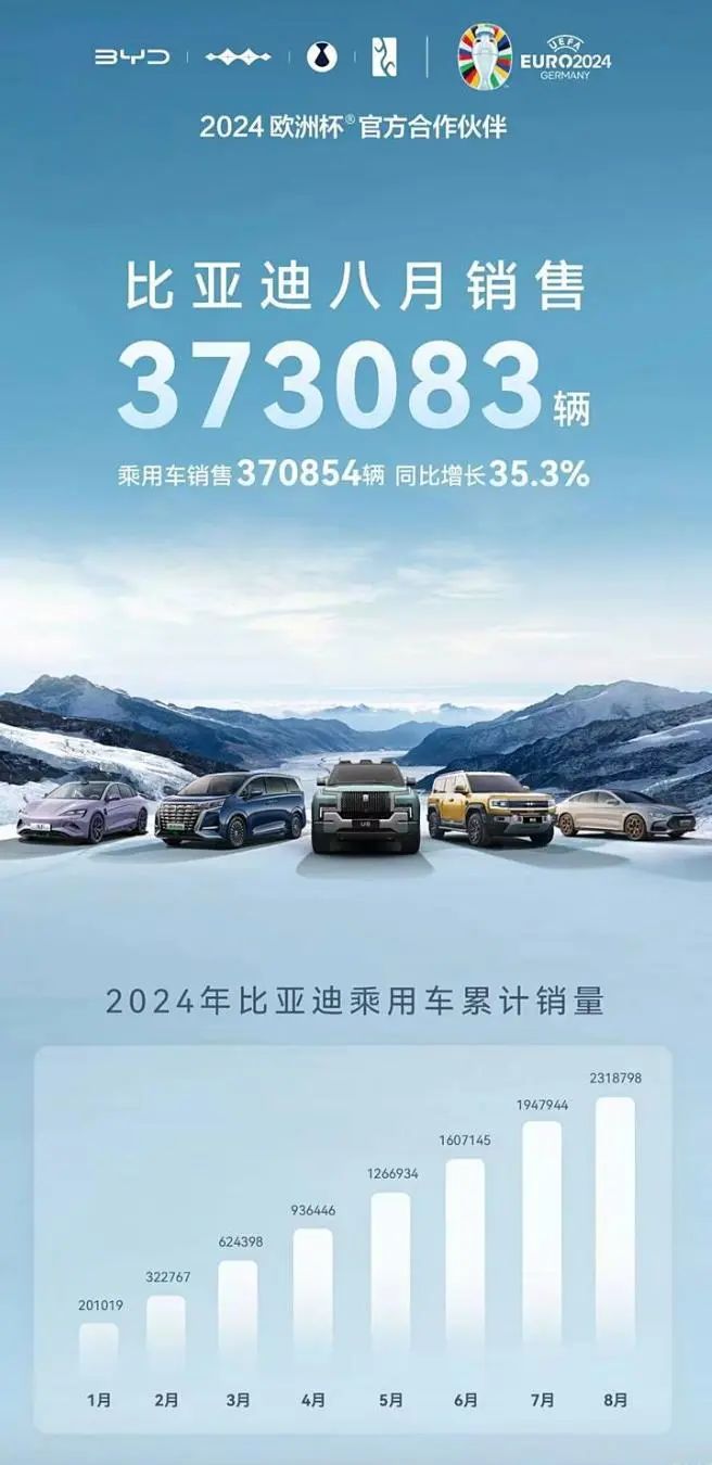 日前,比亚迪公布8月销量为373083辆,乘用车销售370854辆,同比增长35.3%。其中比亚迪王朝+海洋销售355679辆,同比增长35.5%。方程豹汽车销售4876辆。腾势汽车销售9989辆。仰望汽车销售310辆。