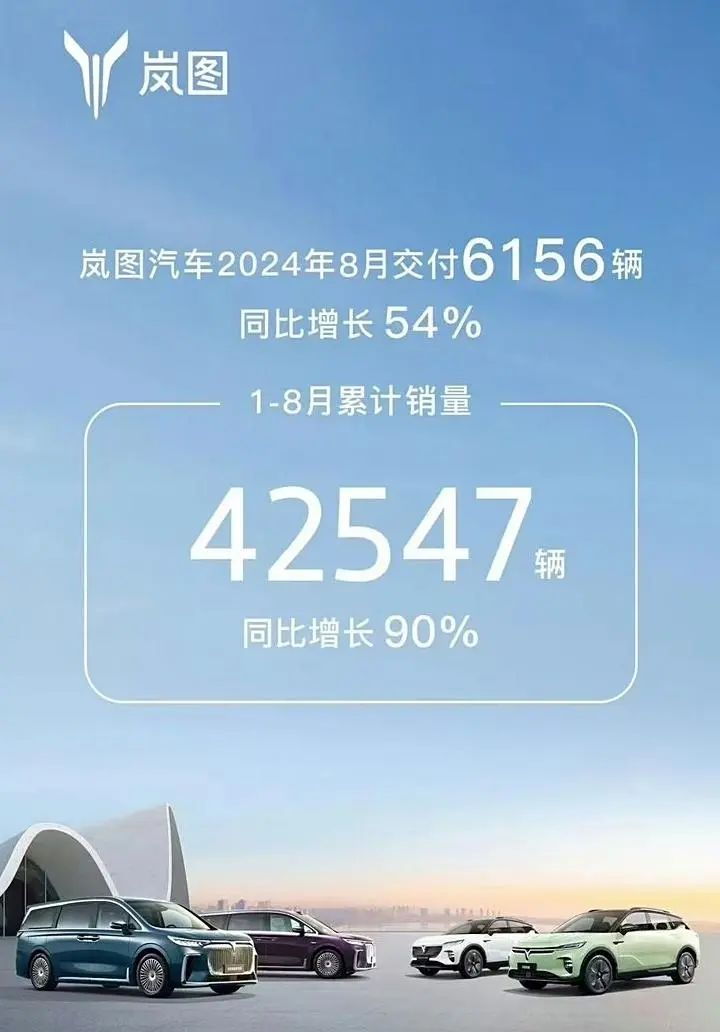 日前,岚图汽车公布其2024年8月共交付6156辆新车,同比增长54%。1-8月累计销量42547辆,同比增长90%。全新岚图梦想家累计订单14000+份,岚图知音累计订单10000+份。