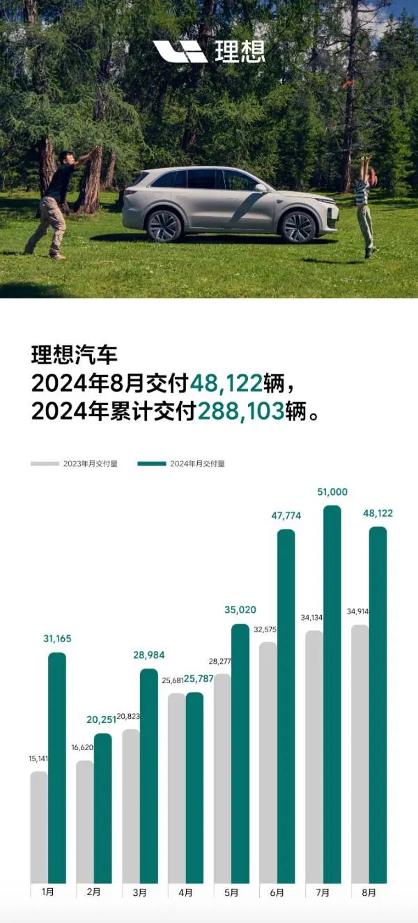 近日,理想汽车公布了2024年8月的交付数据。8月理想汽车交付新车48122辆,同比增长37.8%。2024年1月至8月共计交付288103辆。截至2024年8月31日,理想汽车累计交付921467辆。