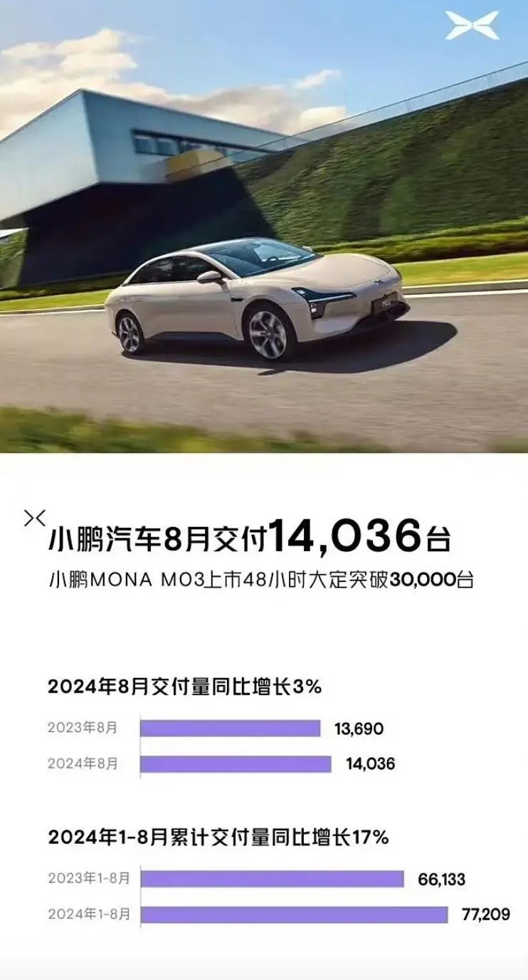 近日,小鹏汽车公布了最新交付数据。2024年8月,小鹏汽车共交付新车14036台,同比增长3%,环比增长26%。2024年1-8月,小鹏汽车累计交付新车共77209台,同比增长17%。