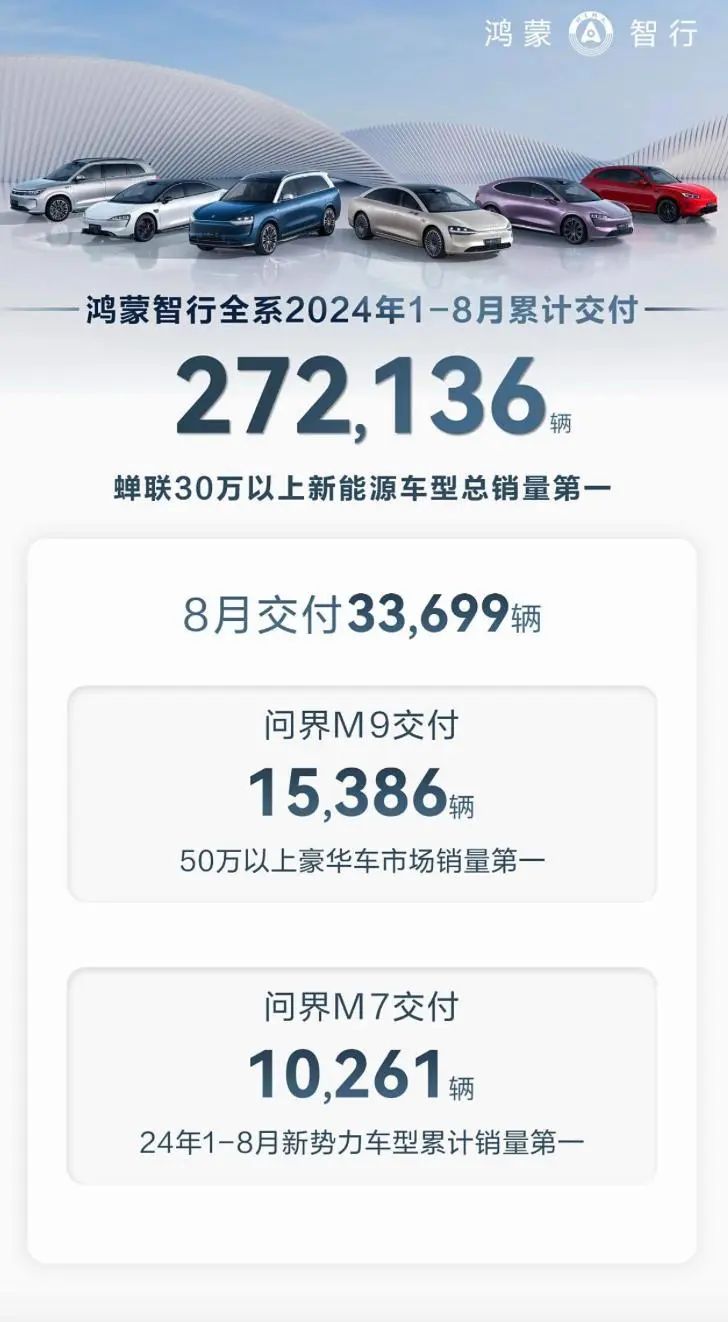 日前,鸿蒙智行公布了最新的交付数据。2024年8月鸿蒙智行共交付新车33699辆,1-8月累计交付新车272136辆。具体到车型,问界M9交付15386辆,问界M7交付10261辆。