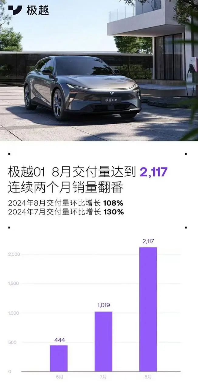 日前,极越公布了8月交付量为2117辆,连续两个月销量翻番,环比增长108%,2024年7月交付量环比增长130%。